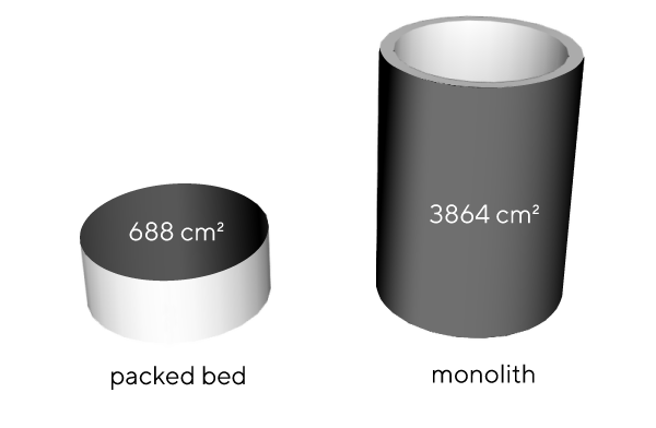 That said, linear flow rates are still interesting in CIM® preparative monoliths (CIMmultus and CIM Tube), and lower than you might think because the short bed length (cylinder wall thickness) corresponds to a very high surface area on the external cylinder wall (Image 1). In a packed particle column, that would correspond to a very large diameter, which would of course have the effect of causing even high volumetric flow rates to correspond to low linear flow rates.