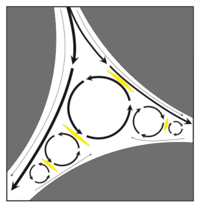 Eddy circulation follows the direction of the dominant bulk flow current. This creates areas where eddy flow is antiparallel with secondary bulk flow currents and adjacent eddies. Shear zones, marked red on Image 3, occur at the interfaces between counter-current flows. Unlike dispersion, which is independent of flow rate, turbulent shear stress is directly proportional to flow rate. This is because it increases the grinding intensity at counter-current interfaces.