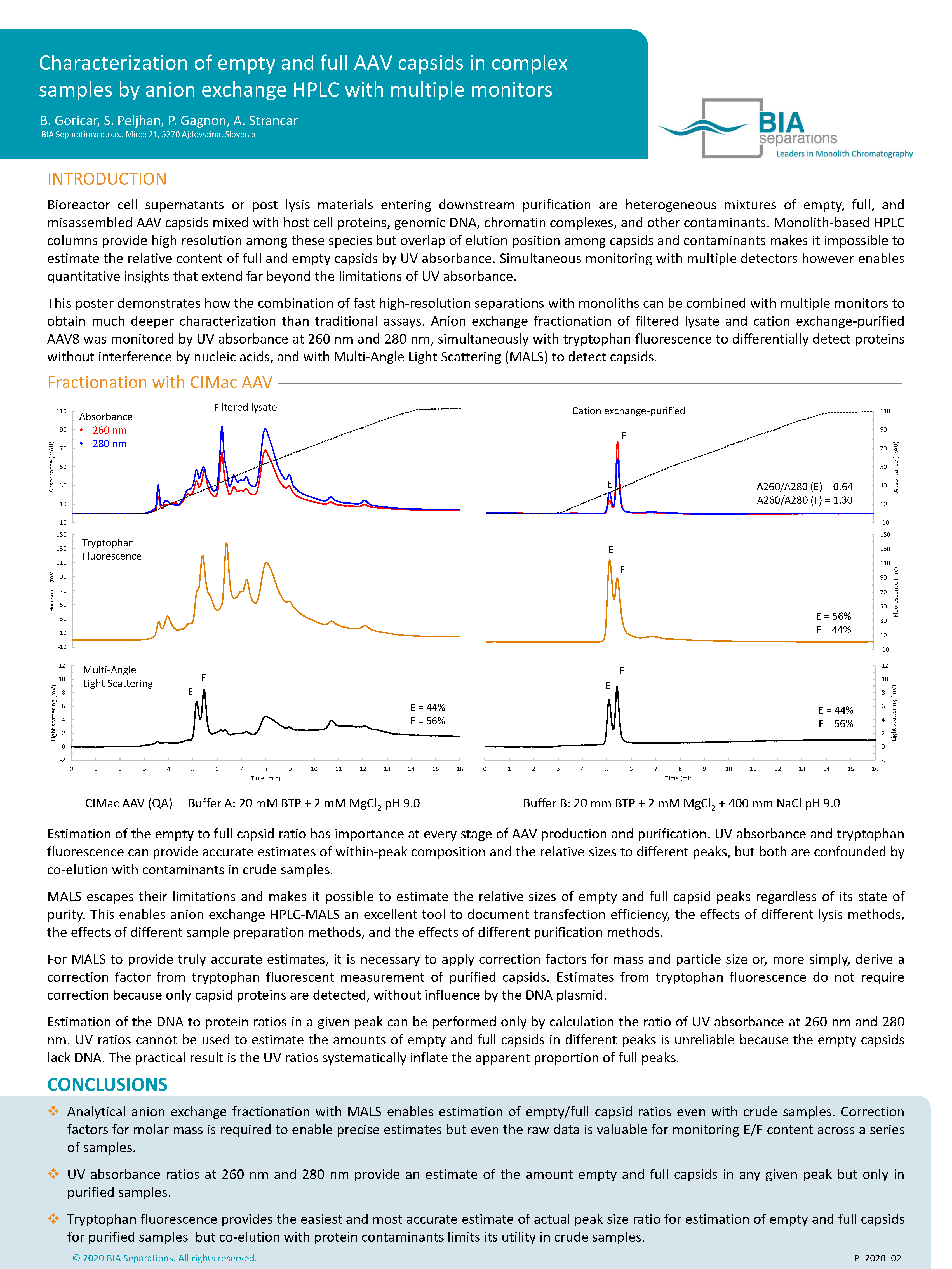 This poster demonstrates how the combination of fast high resolution separations with monoliths can be combined with multiple monitors to obtain much deeper characterization than traditional assays. Anion exchange fractionation of filtered lysate and cation exchange- purified AAV 8 was monitored by UV absorbance at 260 nm and 280 nm, simultaneously with tryptophan fluorescence to differentially detect proteins without interference by nucleic acids, and with Multi Angle Light Scattering (MALS) to detect capsids.