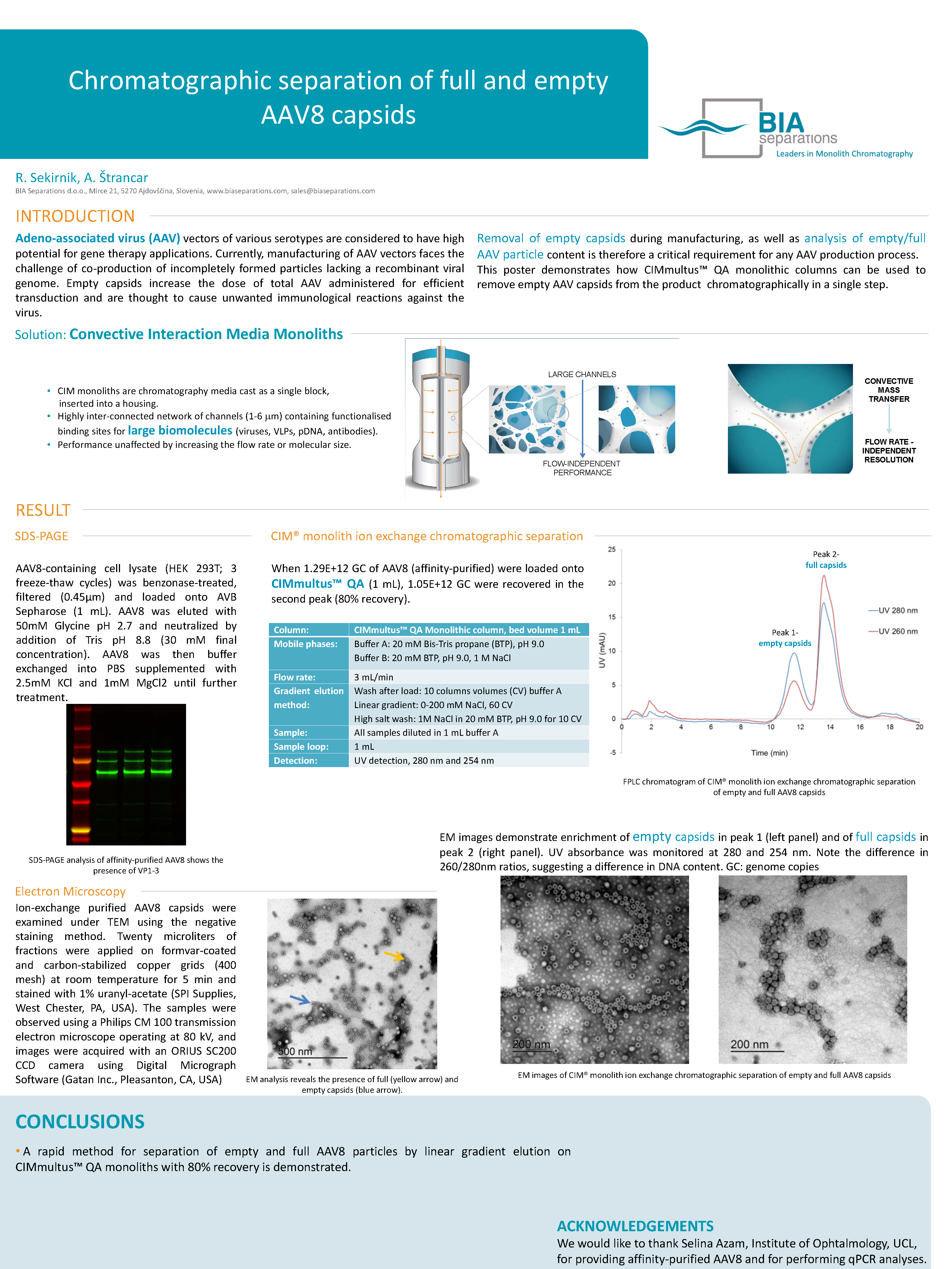 Adeno-associated virus (AAV) vectors of various serotypes are considered to have high potential for gene therapy applications. Currently, manufacturing of AAV vectors faces the challenge of co-production of incompletely formed particles lacking a recombinant viral genome. Empty capsids increase the dose of total AAV administered for efficient transduction and are thought to cause unwanted immunological reactions against the virus. Removal of empty capsids during manufacturing, as well as analysis of empty/full AAV particle content is therefore a critical requirement for any AAV production process. This poster demonstrates how CIMmultus QA monolithic columns can be used to remove empty AAV capsids from the product chromatographically in a single step.