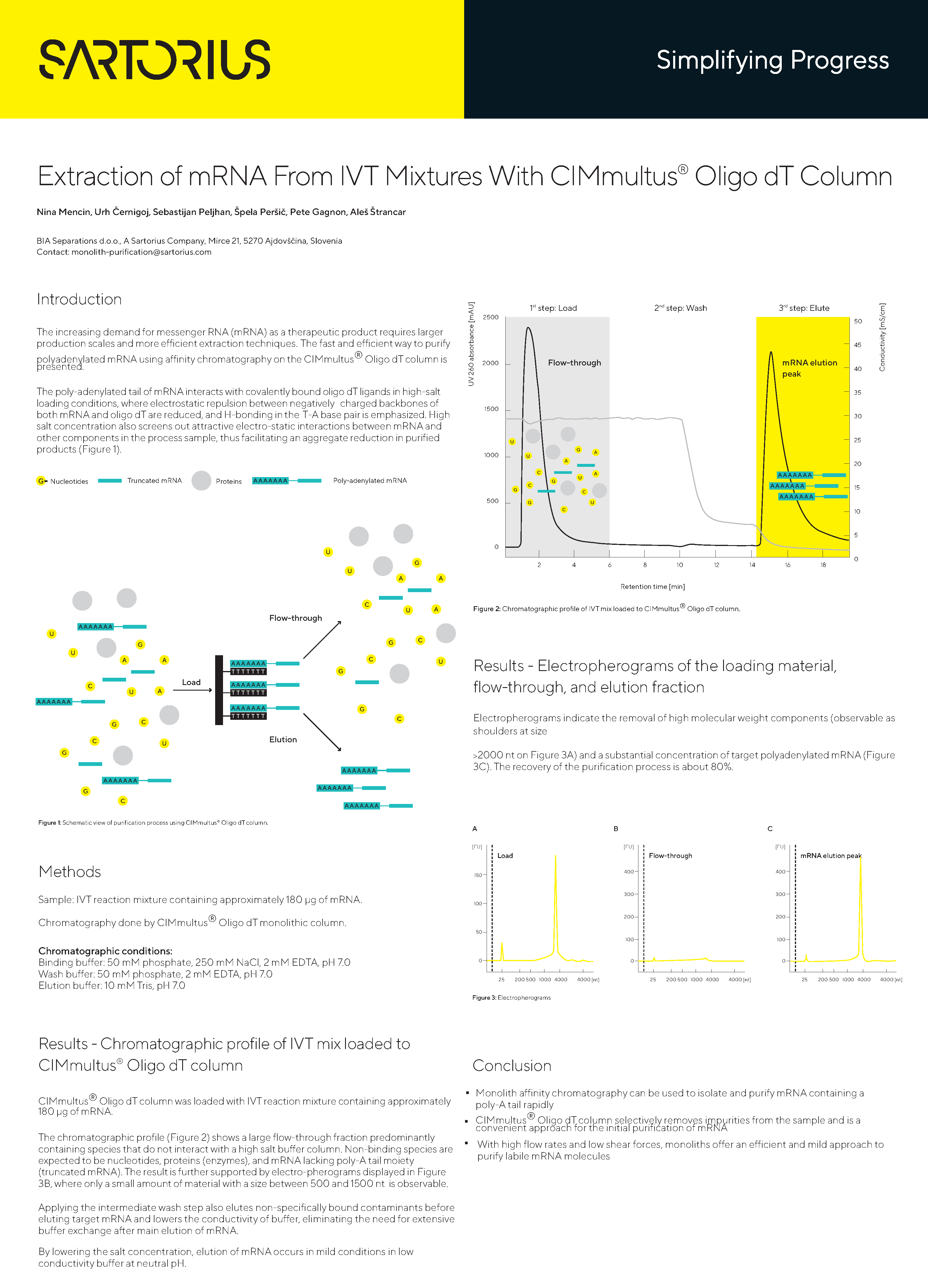 The increasing demand for messenger RNA (mRNA) as a therapeutic product requires larger production scales and more efficient extraction techniques. In this poster, fast and efficient way to purify poly-adenylated mRNA using affinity chromatography on CIMmultus Oligo dT column is presented.