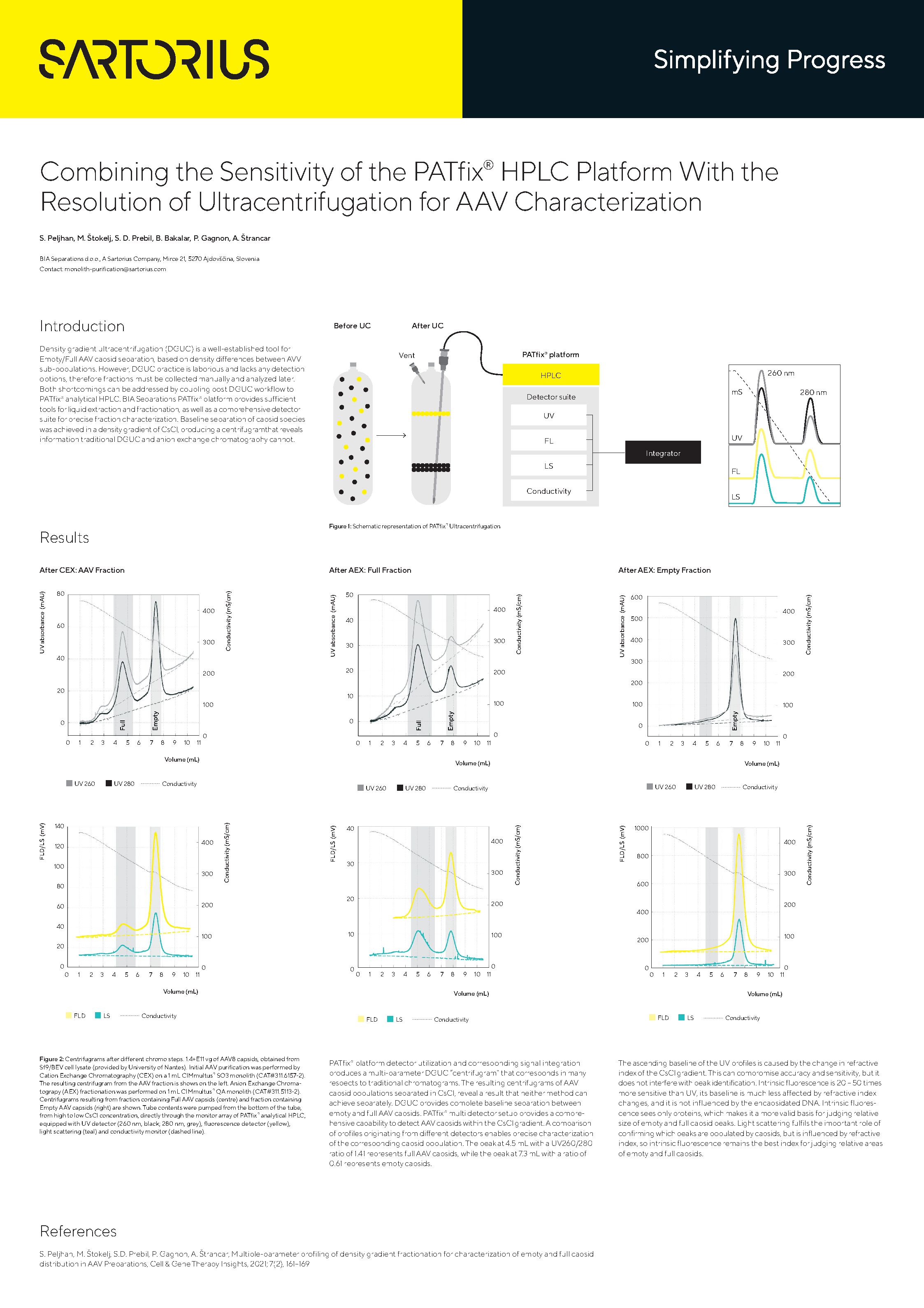 BIA Separations, Inc. PATfix platform provides sufficient tools for liquid extraction and fractionation as well as a comprehensive detector suite for precise fraction characterization. Baseline separation of capsid species was achieved in a density gradient of CsCl, producing a centrifugram that reveals information traditional DGUC and anion exchange chromatography cannot.
