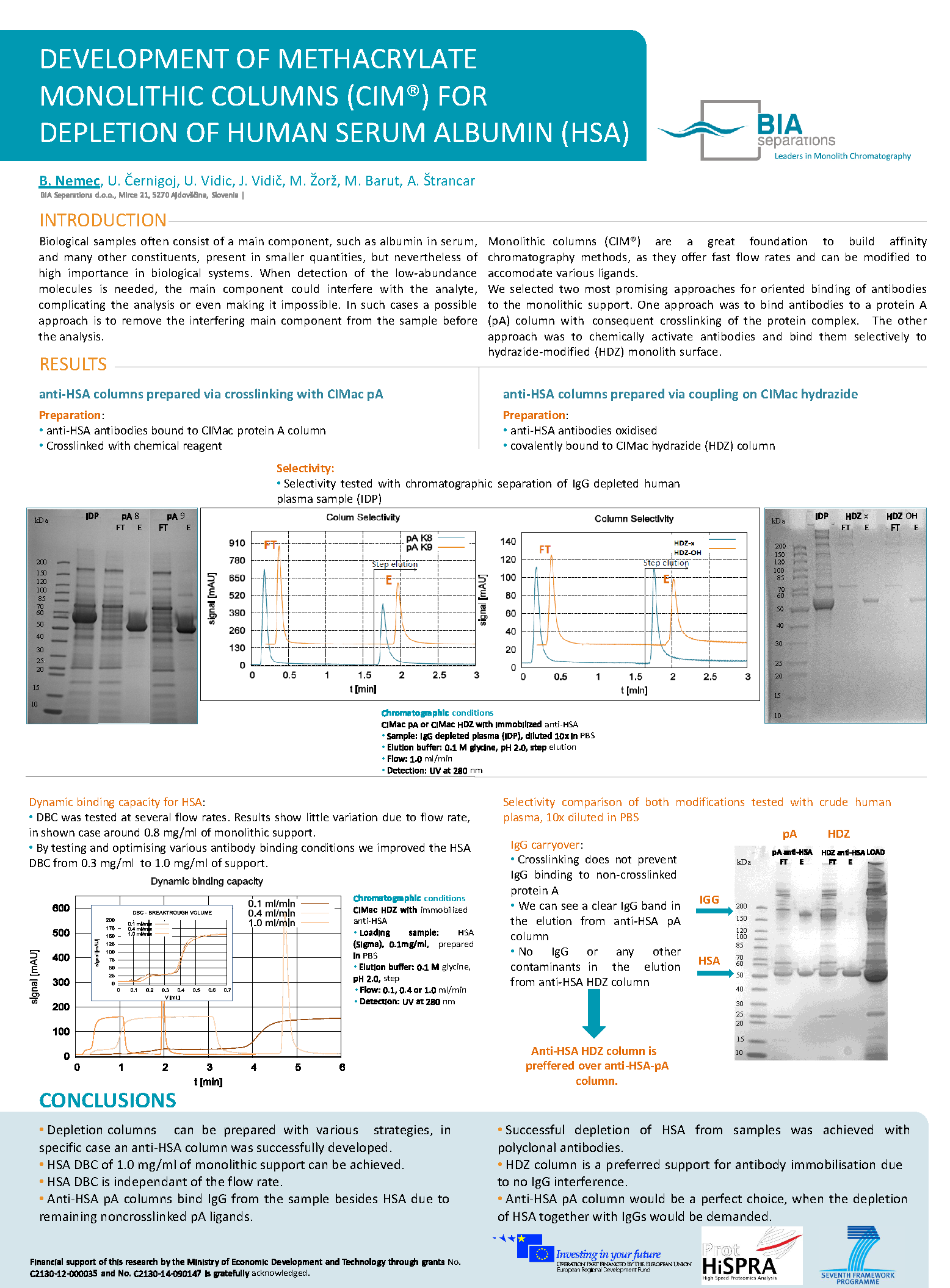 Monolithic columns (CIM) are a great foundation to build affinity chromatography methods, as they offer fast flow rates and can be modified to accommodate various ligands. We selected two most promising approaches for oriented binding of antibodies to the monolithic support. One approach was to bind antibodies to a protein A (pA) column with consequent crosslinking of the protein complex. The other approach was to chemically activate antibodies and bind them selectively to hydrazide-modified (HDZ) monolith surface.