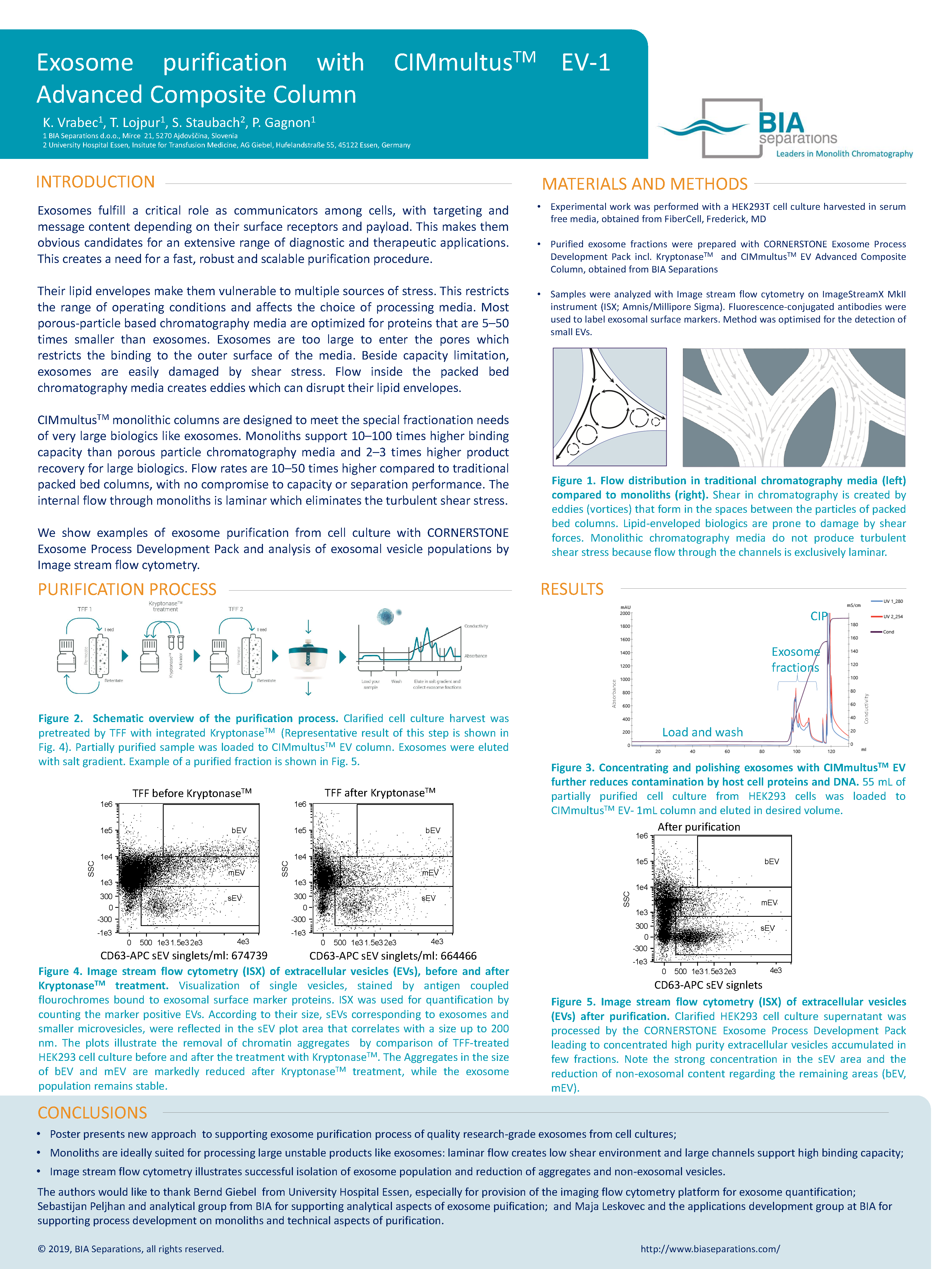 CIMmultus monolithic columns are designed to meet the special fractionation needs of very large biologics like exosomes. We show examples of exosome purification from cell culture with CORNERSTONE Exosome Process Development Pack and analysis of exosomal vesicle populations by Image stream flow cytometry.