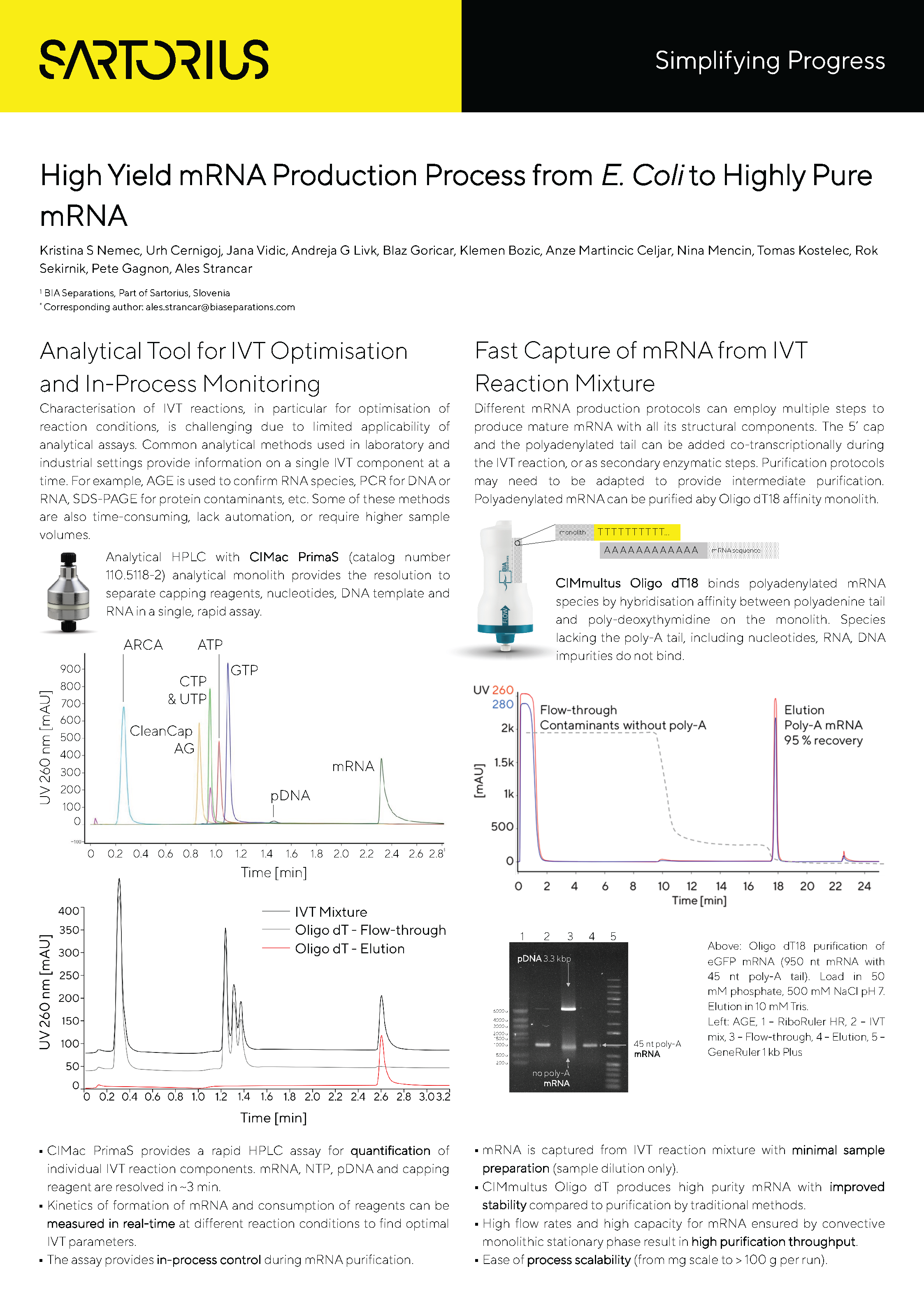 Here we present a chromatographic toolbox and mRNA IVT synthesis for integrated mRNA production from pDNA to mRNA purification, including in-process analytics. This high yield process reduces the overall number of purification steps required, improves recoveries, results in extra low protein impurity and allows for very efficient dsRNA removal.