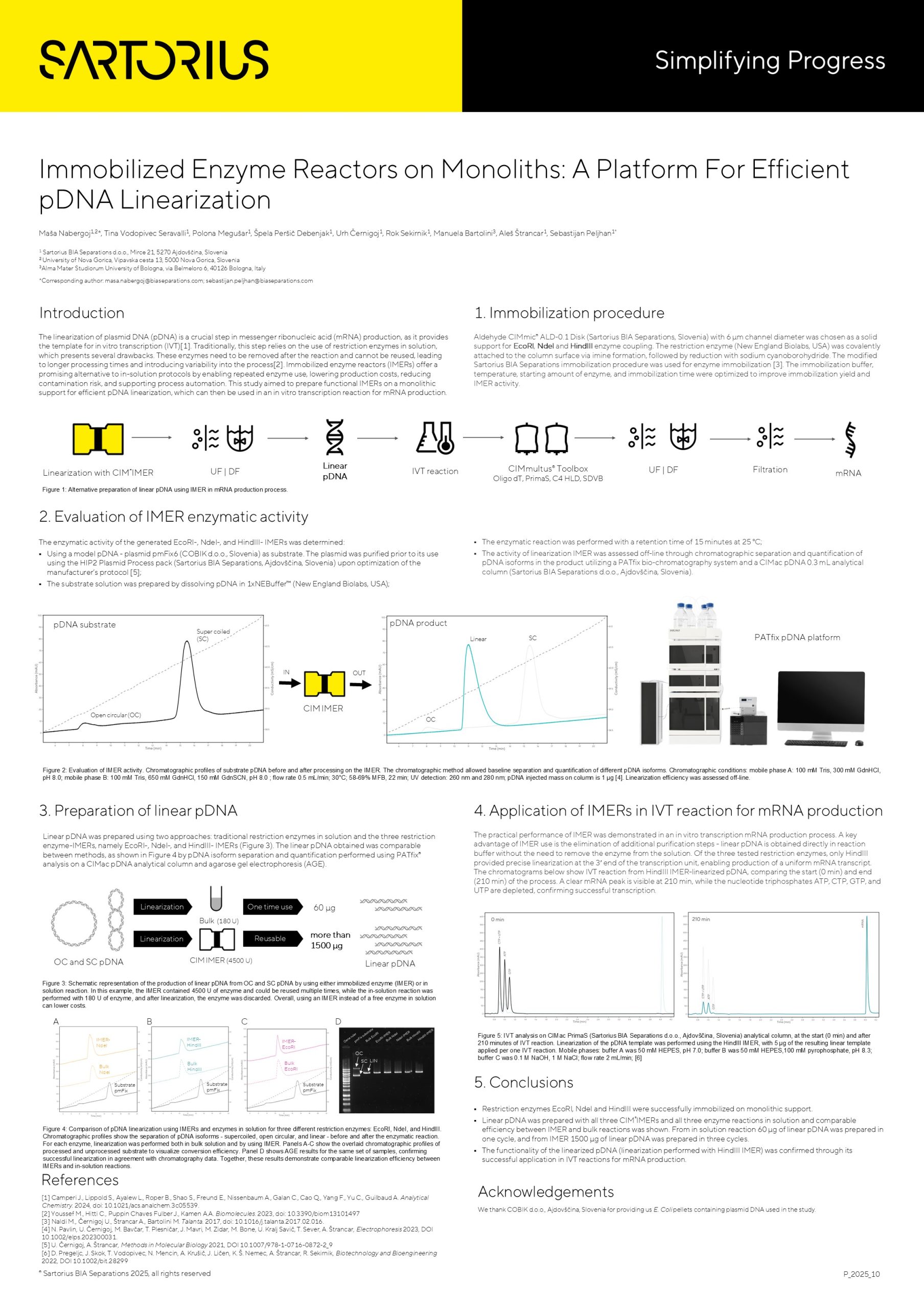Immobilized enzyme reactors (IMERs) on monolithic supports were developed for efficient plasmid DNA linearization, a critical step in mRNA production. EcoRI, NdeI, and HindIII were successfully immobilized, achieving comparable linearization efficiency to in-solution methods without the need for enzyme removal. HindIII IMER-linearized pDNA was directly used in IVT reactions, confirming its suitability for mRNA synthesis.