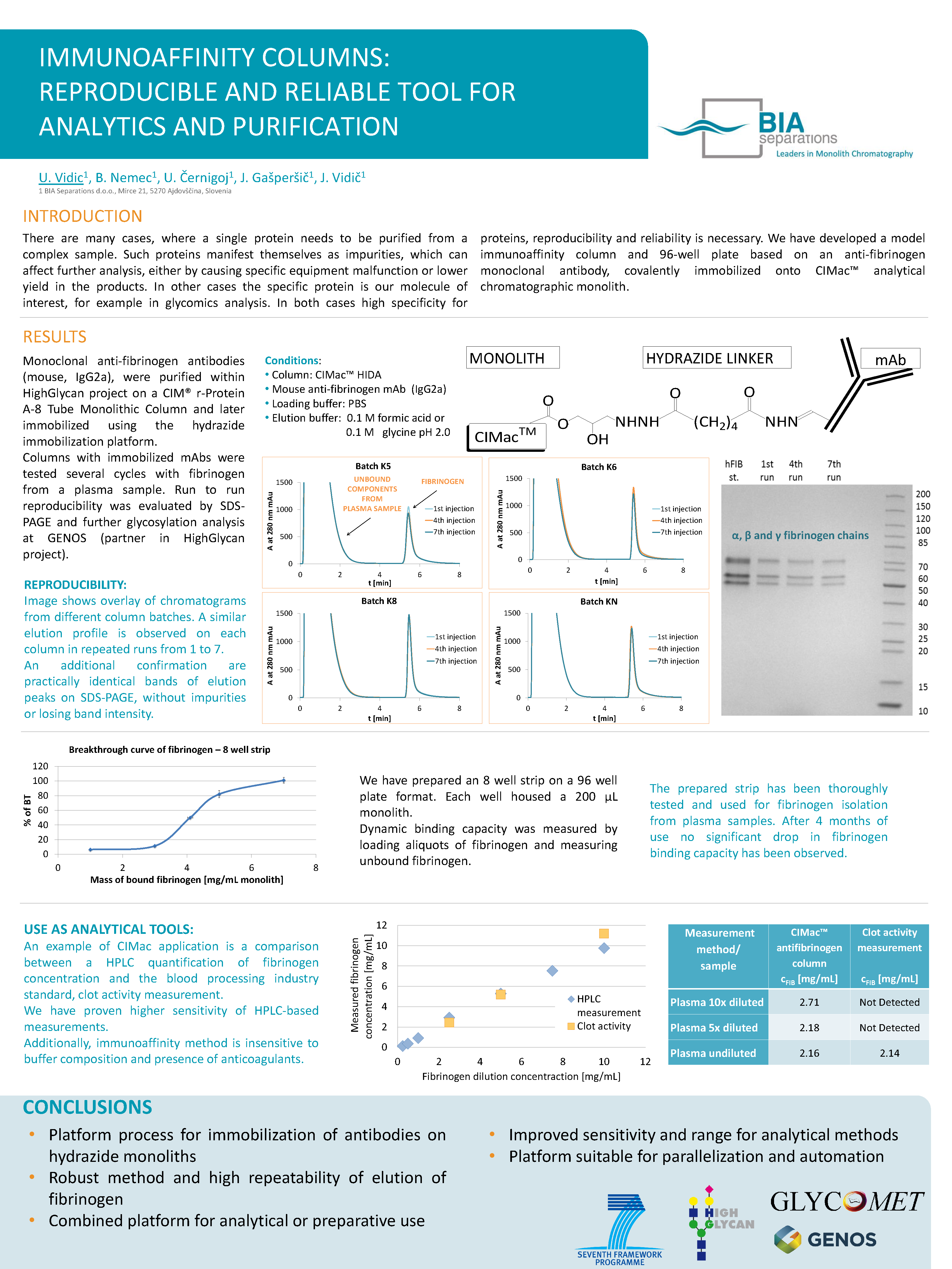 We have developed a model immunoaffinity column and 96-well plate based on an anti-fibrinogen monoclonal antibody, covalently immobilized onto CIMac HDZ analytical chromatographic monolith.