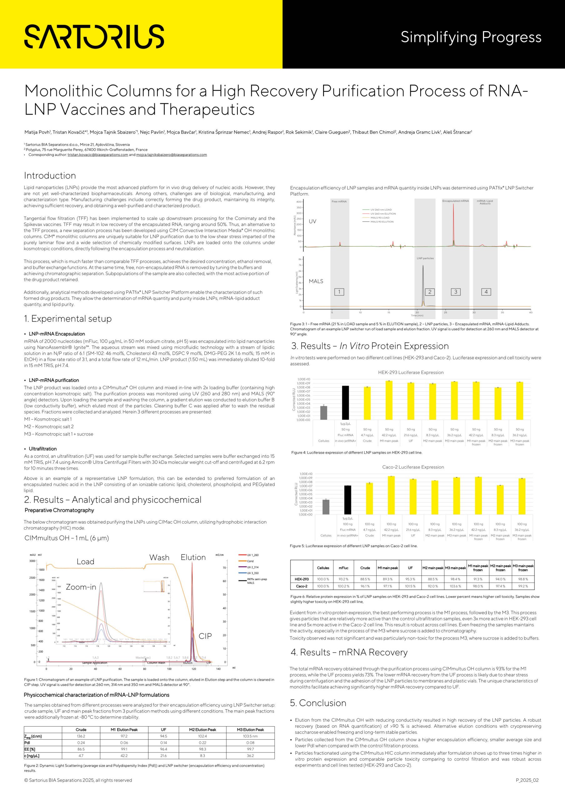 Tangential flow filtration (TFF) has been implemented to scale up downstream processing for the Comirnaty and the Spikevax vaccines. TFF may result in low recovery of the encapsulated RNA, ranging around 50%. Thus, an alternative to the TFF process, a new separation process has been developed using CIM Convective Interaction Media® OH monolithic columns. CIM® monolithic columns are uniquely suitable for LNP purification due to the low shear stress imparted of the purely laminar flow and a wide selection of chemically modified surfaces. LNPs are loaded onto the columns under kosmotropic conditions, directly following the encapsulation process and neutralization. This process, which is much faster than comparable TFF processes, achieves the desired concentration, ethanol removal, and buffer exchange functions. At the same time, free, non-encapsulated RNA is removed by tuning the buffers and achieving chromatographic separation. Subpopulations of the sample are also collected, with the most active portion of the drug product retained.