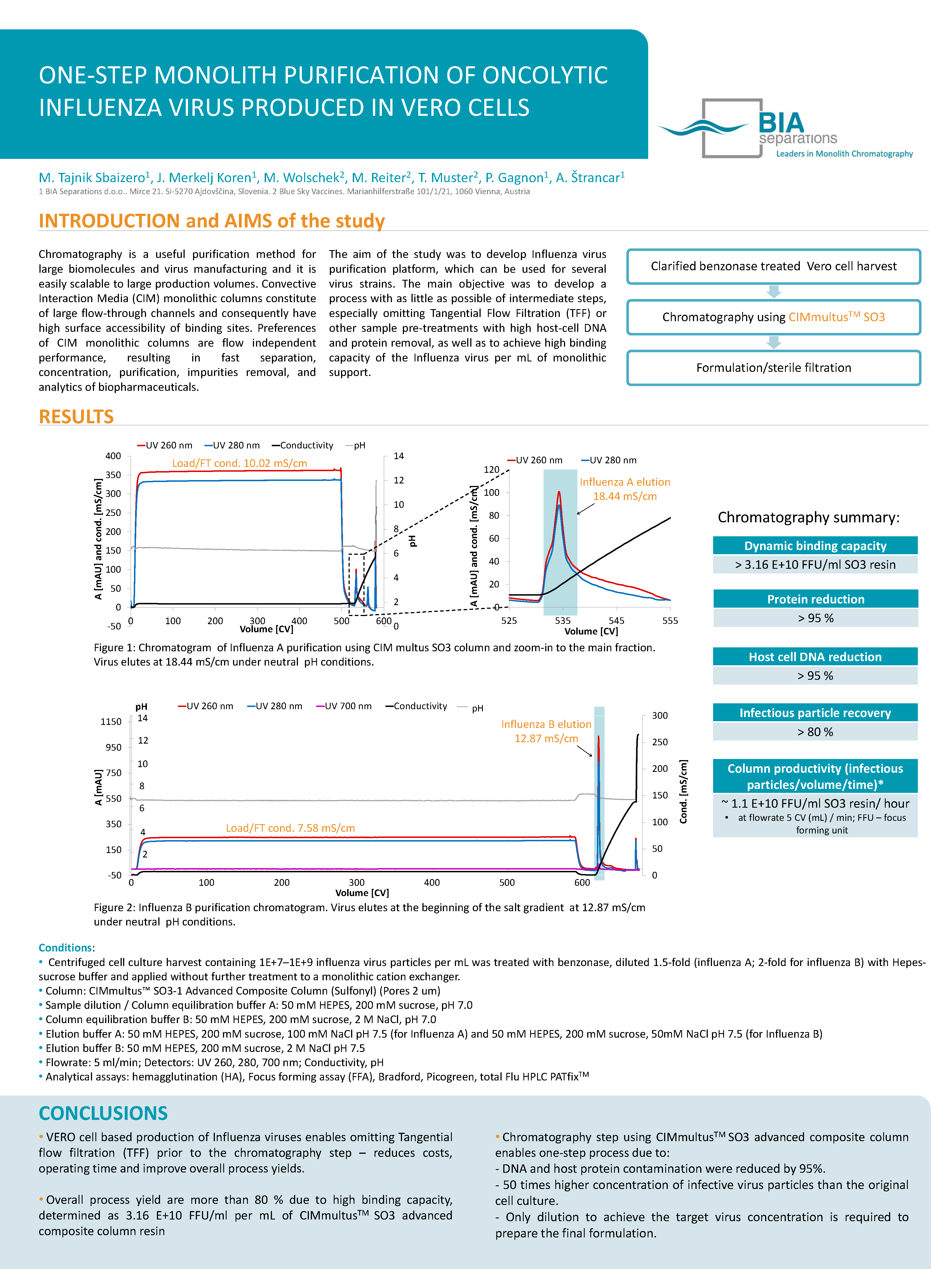Chromatography is a useful purification method for large biomolecules and virus manufacturing and it is easily scalable to large production volumes. Convective Interaction Media (CIM) monolithic columns constitute of large flow-through channels and consequently have high surface accessibility of binding sites. Preferences of CIM monolithic columns are flow independent performance, resulting in fast separation, concentration, purification, impurities removal, and analytics of biopharmaceuticals.