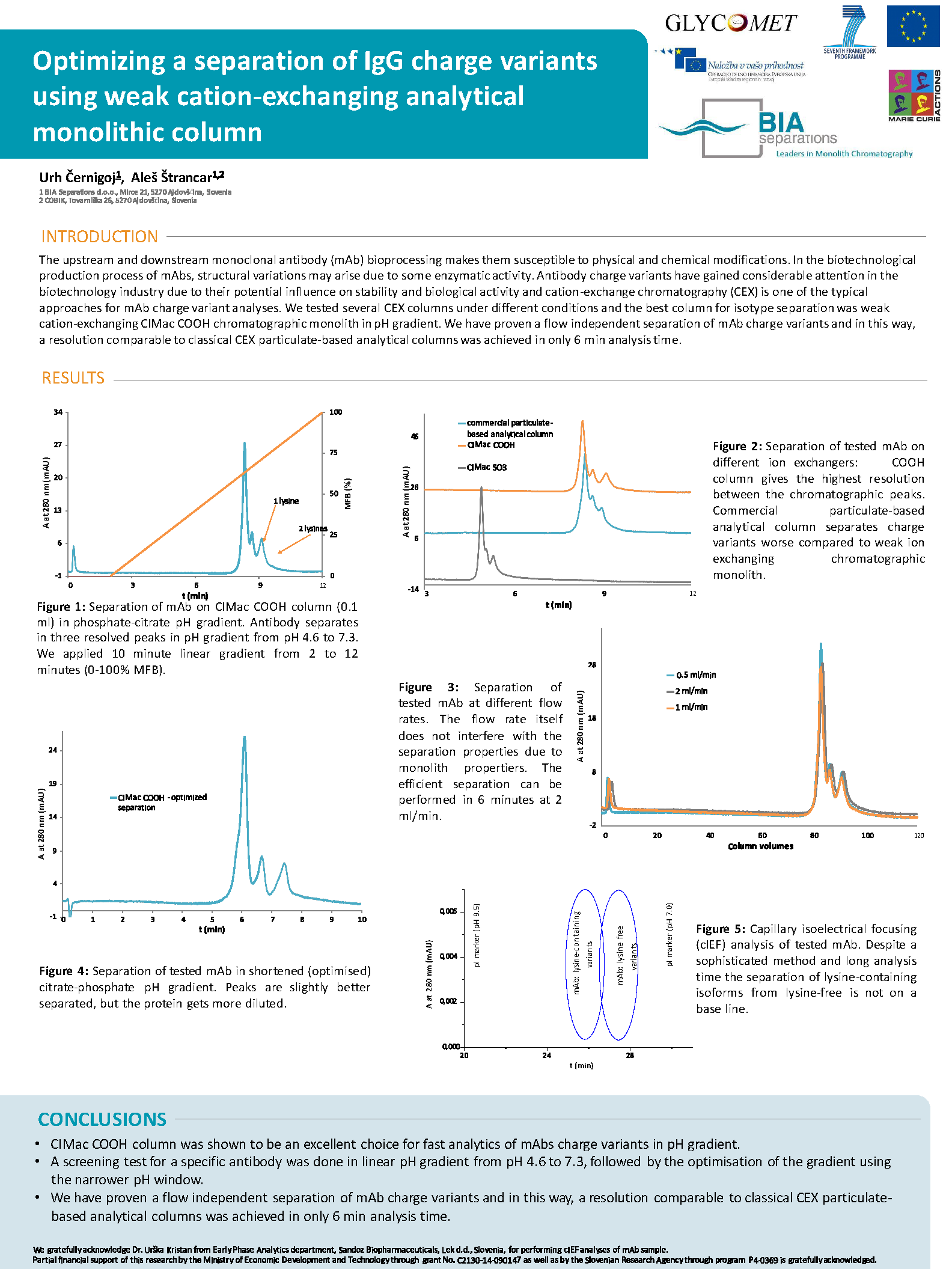The upstream and downstream monoclonal antibody (mAb) bioprocessing makes them susceptible to physical and chemical modifications. In the biotechnological production process of mAbs, structural variations may arise due to some enzymatic activity. Antibody charge variants have gained considerable attention in the biotechnology industry due to their potential influence on stability and biological activity and cation-exchange chromatography (CEX) is one of the typical approaches for mAb charge variant analyses. We tested several CEX columns under different conditions and the best column for isotype separation was weak cation-exchanging CIMac COOH chromatographic monolith in pH gradient. We have proven a flow independent separation of mAb charge variants and in this way, a resolution comparable to classical CEX particulate-based analytical columns was achieved in only 6 min analysis time.