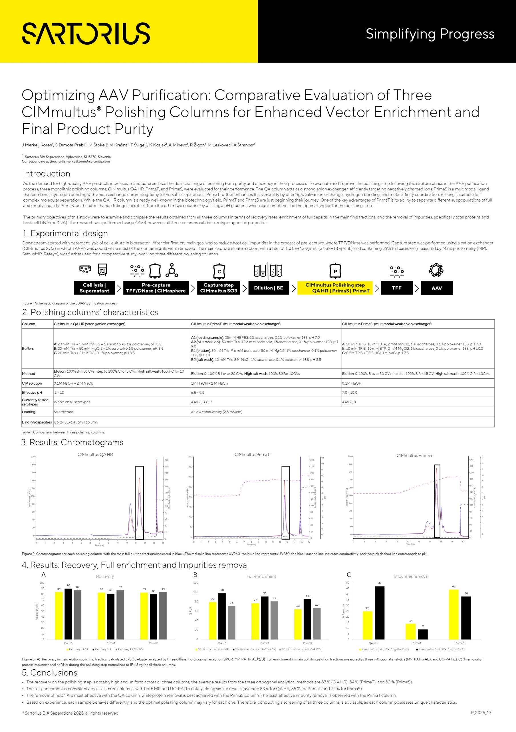The poster presents a comparative evaluation of three CIMmultus® polishing columns—QA HR, PrimaT, and PrimaS—in optimizing the purification of AAV vectors. Highlighting their unique strengths, the study reveals QA HR’s superior hcDNA removal, PrimaS’s exceptional protein impurity elimination, and PrimaT’s versatility in capsid separation. Discover how these columns can enhance vector enrichment and purity, offering tailored solutions for your AAV purification needs.