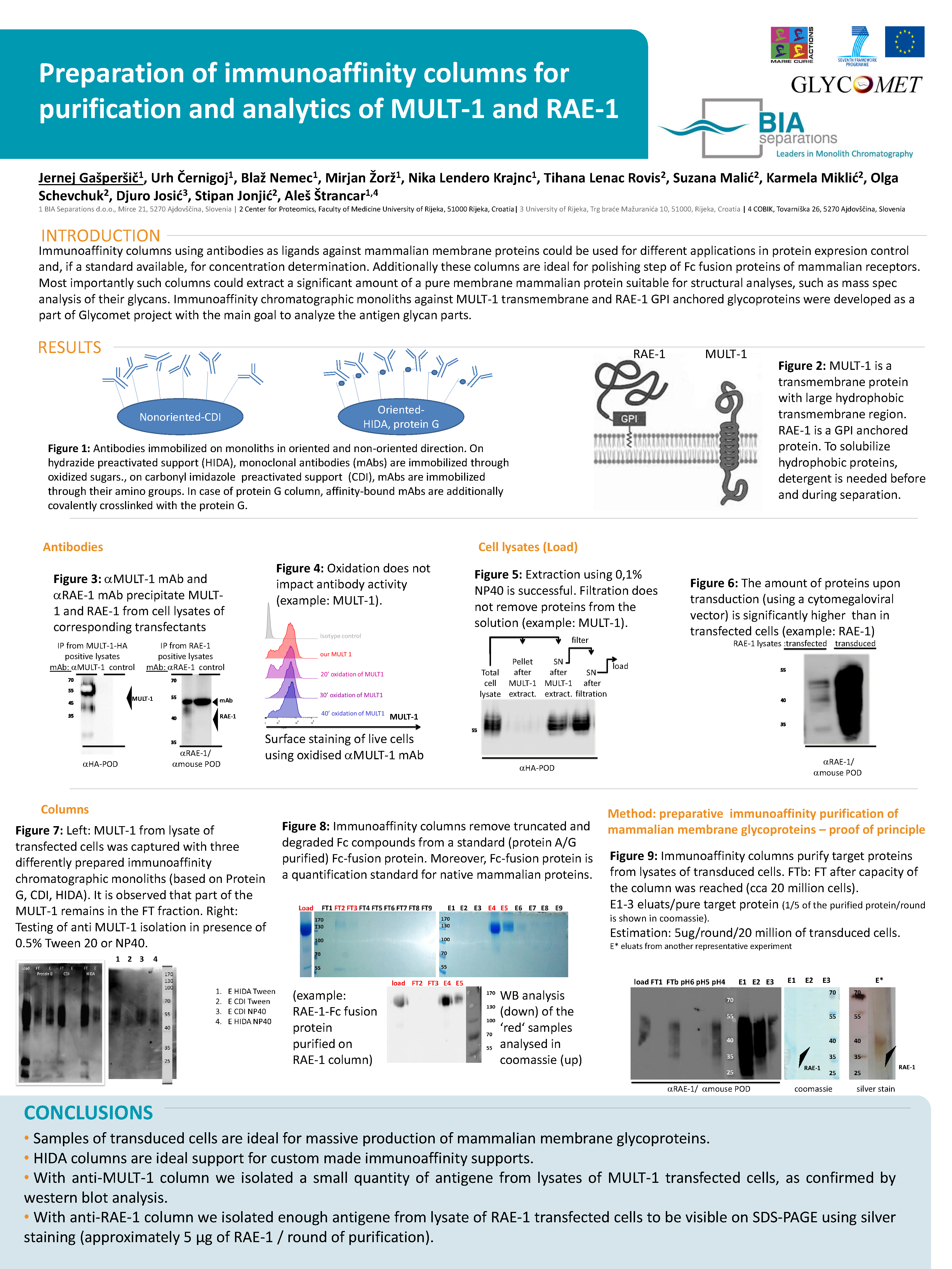 Most importantly such columns could extract a significant amount of a pure membrane mammalian protein suitable for structural analyses, such as mass spec analysis of their glycans. Immunoaffinity chromatographic monoliths against MULT-1 transmembrane and RAE-1 GPI anchored glycoproteins were developed as a part of Glycomet project with the main goal to analyze the antigen glycan parts.