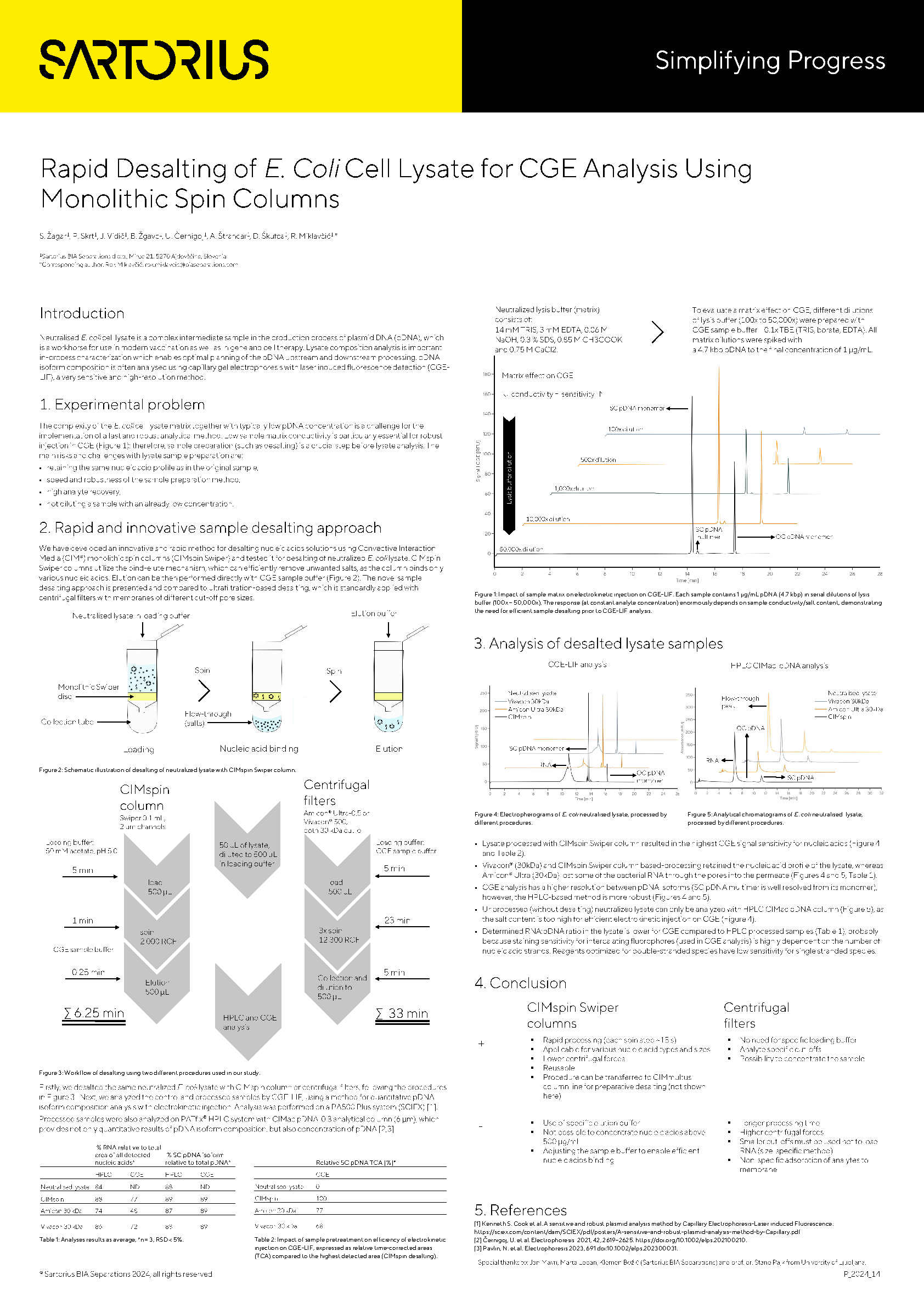 Neutralized E. coli cell lysate is a complex intermediate sample in the production process of plasmid DNA (pDNA) for use in vaccines and gene therapy. It contains various amounts of pDNA isoforms together with bacterial RNA and remains of bacterial genomic DNA, together with different ions (Na+, Ca2+, K+, NH4+, acetate, SO42- etc.) in millimolar to molar concentration range. These salts interfere with different analytical techniques, used for lysate characterization, thus decreasing method accuracy, sensitivity and/or robustness. One example of extremely matrix-dependent analytical technique is capillary gel electrophoresis (CGE) with LIF detection, which is often used for the analysis of pDNA isoform composition. Low sample conductivity is particularly essential for robust injection, which is not easily achieved for complex samples such as E. coli cell lysate. Currently, centrifugal filters with membranes of different materials and pore size cut-offs are used for sample desalting via ultrafiltration, where the degree of desalting is linked to the number of centrifugation cycles.