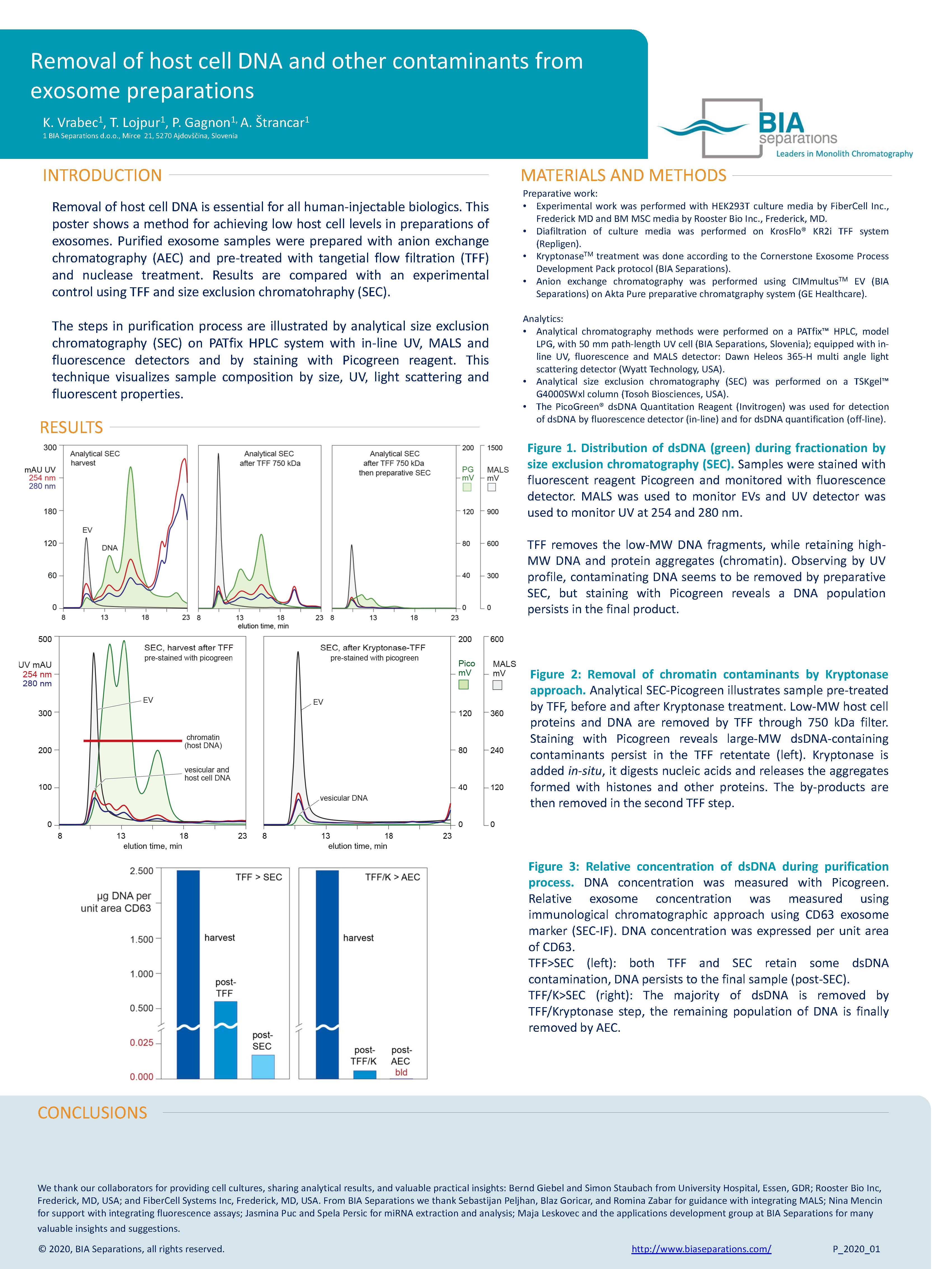 Removal of host cell DNA is essential for all human-injectable biologics. This poster shows a method for achieving low host cell levels in preparations of exosomes. Purified exosome samples were prepared with anion exchange chromatography (AEC) and pre-treated with tangetial flow filtration (TFF) and nuclease treatment. Results are compared with an experimental control using TFF and size exclusion chromatohraphy (SEC).