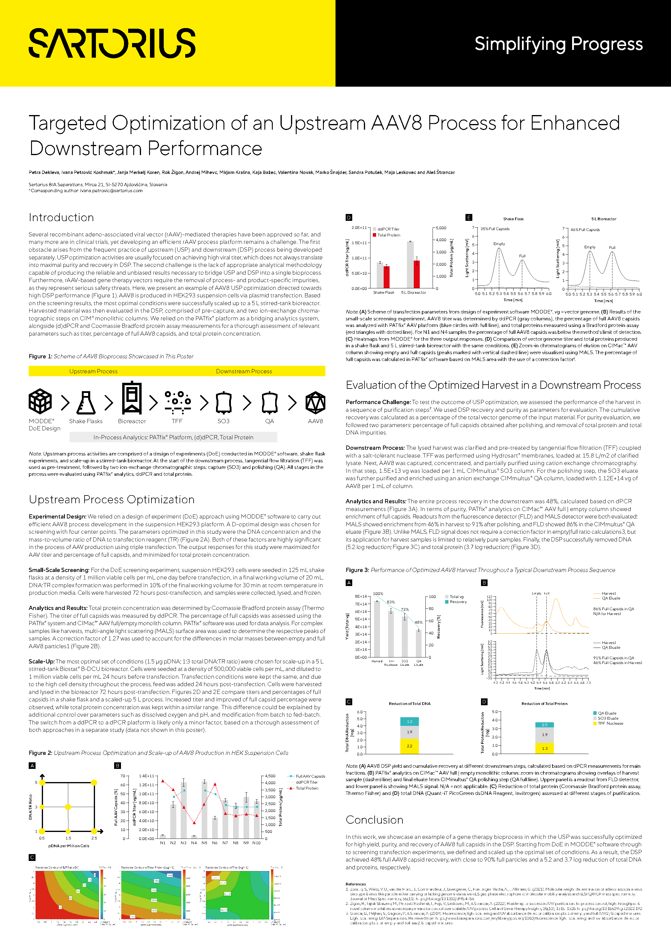 Here we showcase the example of AAV8 USP optimization directed towards good performance in DSP. AAV8 is produced in HEK suspension cells via plasmid transfection. Based on the screening results, the best performing set of conditions was successfully scaled up to a 5L stirred-tank bioreactor. Harvested material was then evaluated in DSP, comprised of pre-capture, and two ion-exchange chromatographic steps on CIM monolithic columns. As bridging analytics of choice, we relied on PATfix platform, (d)dPCR and Comassie Bradford protein assay measurements for thorough assessment of relevant parameters such as titer, percentage of full AAV8 capsids and total protein concentration.