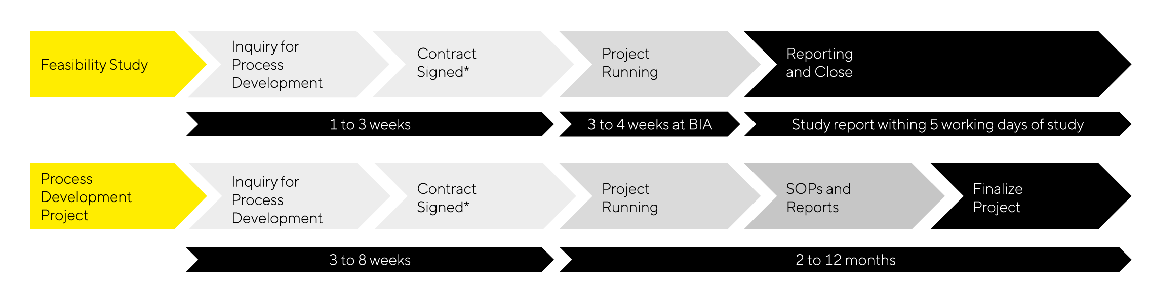 Start with a feasibility study to establish proof of concept without the optimization of work or robustness checks. The study usually takes 1 month or less and provides a brief report with purification data and results. Usually, one scientist is involved.