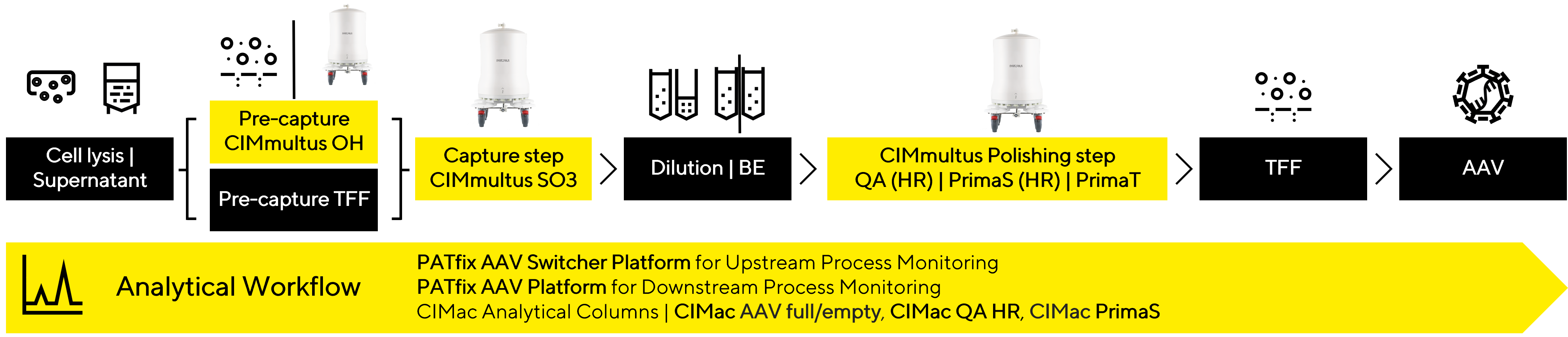 In combination with the analytical CIMac columns, the PATfix system can achieve cutting-edge sample characterisation in a single chromatographic run just in a few minutes. Combined with orthogonal methods, e.g. ddPCR, ELISA, AUC, cryoTEM, it offers a versatile & robust analytical toolkit that meets the challenges of gene therapy viral vectors production.
