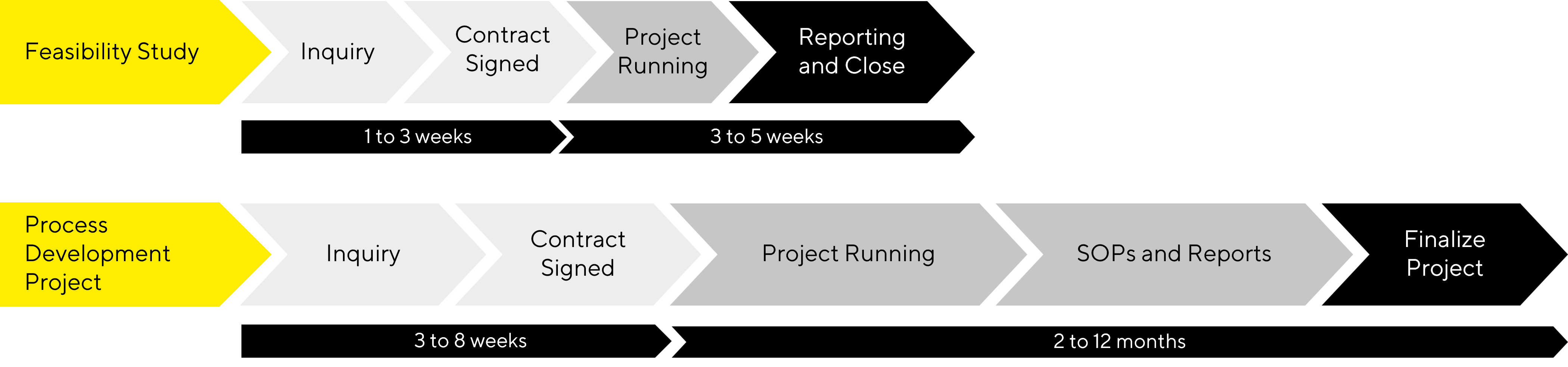 Start with a feasibility study to establish proof of concept without the optimization of work or robustness checks. The study usually takes 1 month or less and provides a brief report with purification data and results. Usually, one scientist is involved.